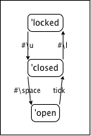 Now that we have a data definition, we must also decide which computer actions and interactions should model the various actions on the door. Our pictorial representation of the door’s states and transitions, specifically the arrow from "open" to "closed" suggests the use of a function that simulates time. For the other three arrows, we could use either keyboard events or mouse clicks or both. Our solution uses three keystrokes: #\u for unlocking the door, #\l for locking it, and #\space for pushing it open. We can express these choices graphically by translating the above "state machine" from the world of information into the world of data: